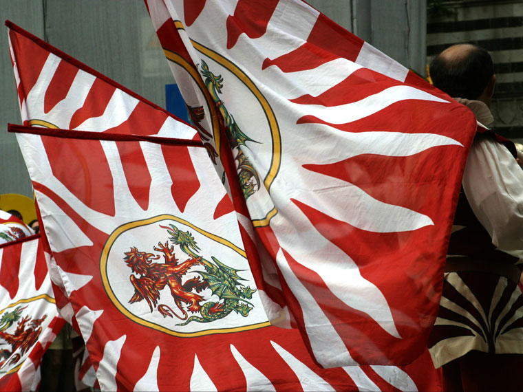 Volterrra during the AD1398 festivities. Flagwavers show their skills waving, throwing and exchanging flags with other members.