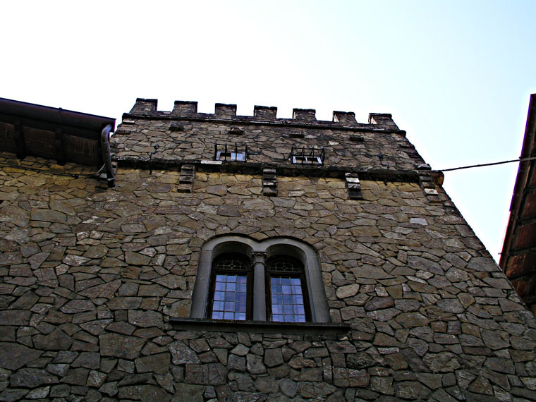 Detail of a stone palace in the medieval village of Montefioralle.
