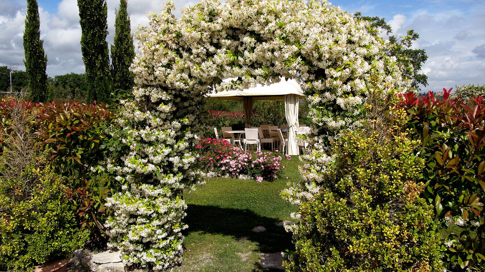 Couples from all over the world come to celebrate their vows, honeymoon & anniversaries at Taverna Bibbiano There are ample secret corners where you can seek out some special private time to enjoy the tranquility, the perfumes of Tuscany and panoramic views of San Gimignano. Their trademarks are the bountiful lavender bushes that provide the basis for so many of their special holiday gifts and recipes. The roses in the gardens start blooming in late April & May and keep their lovely colors all the way into November.