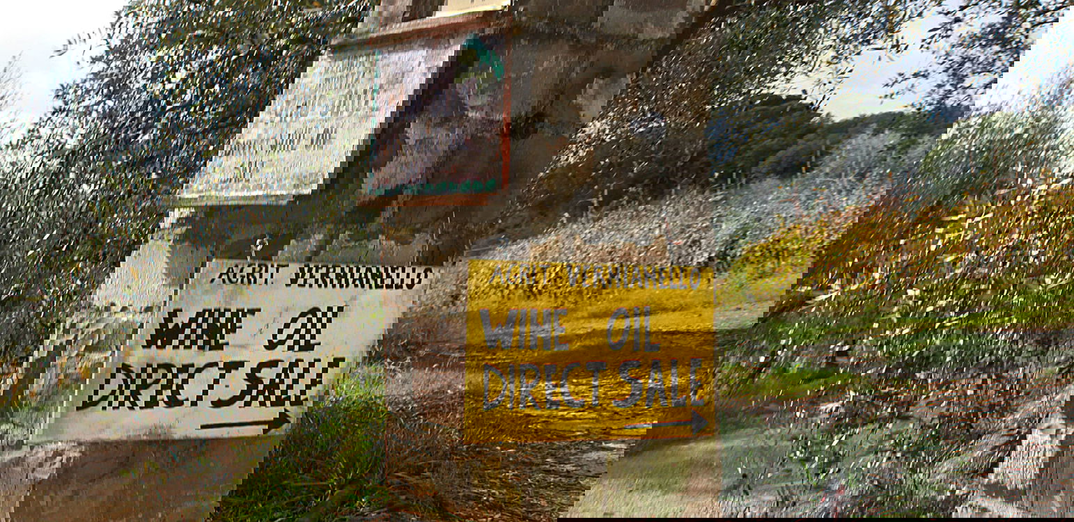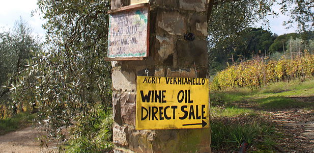 The reminder of the area's fine wines comes along as we discover that the Vernianello farmhouse is right off a curve where a gigantic bottle cork of wine sits, used to publicize the region's summer wine events a few years ago and now a bit weather-beaten. Yellow signs indicate the way down on an unpaved road amidst the vineyards until you reach a lane that leads to the farmhouse, with olive trees lining the way on one side and a stone wall on the other. Anyone can stop by at any time to buy the estate's Chianti wines and olive oil directly.